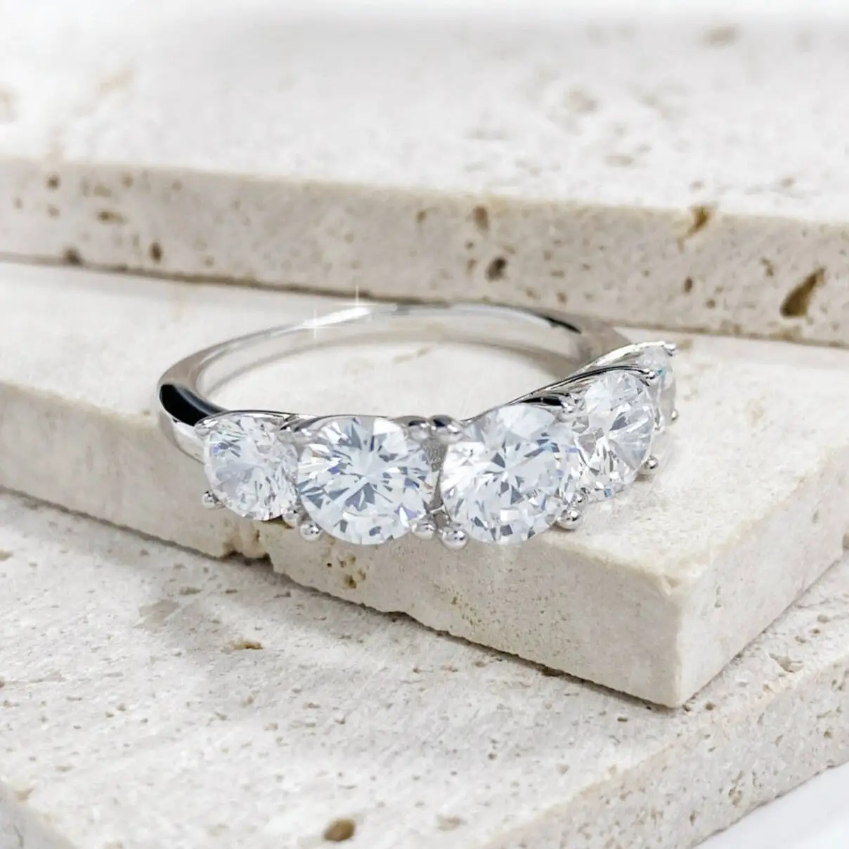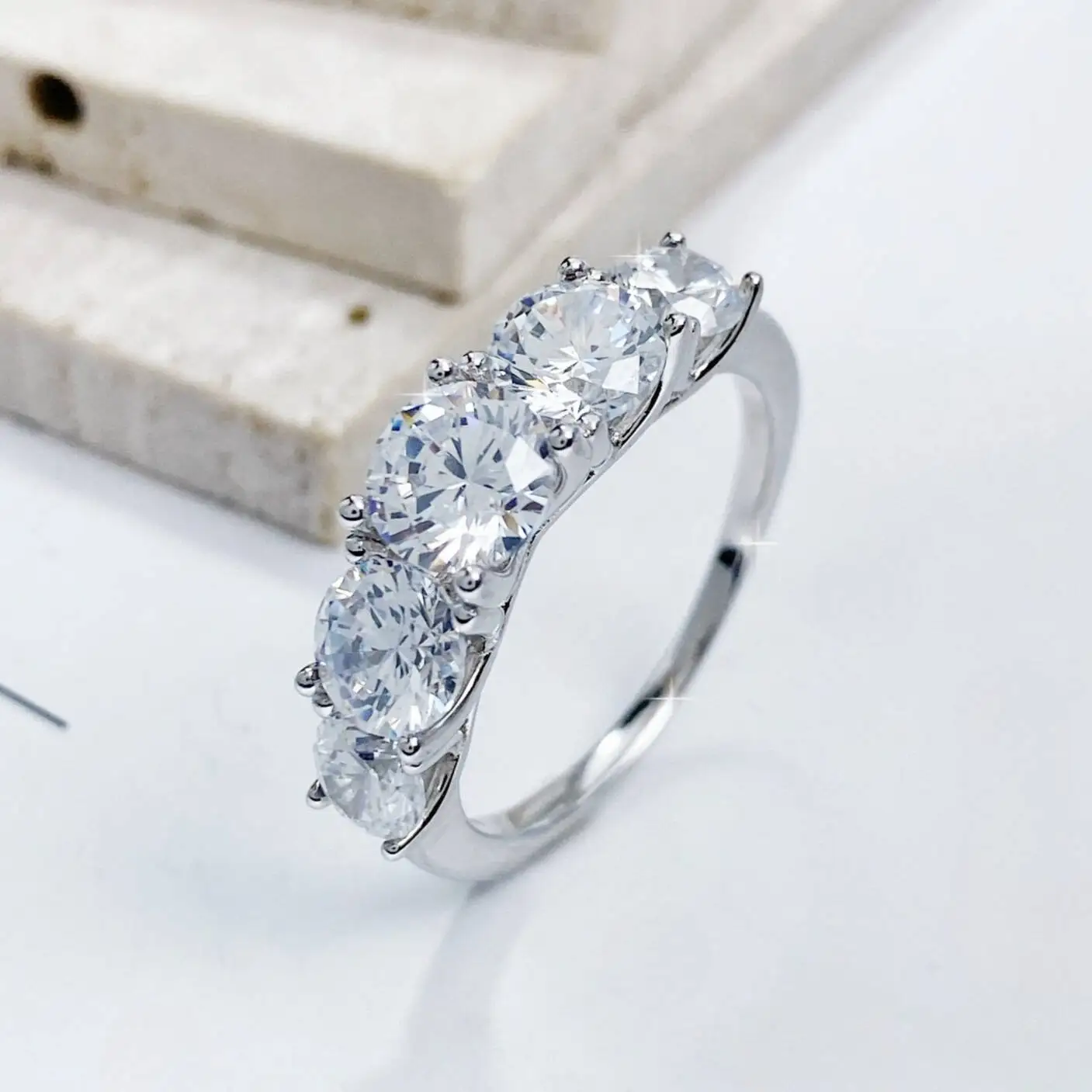 Experience timeless elegance with this exquisite 3.6CT five-stone moissanite ring, designed to radiate brilliance from every angle. Each round-cut moissanite is expertly set in a secure prong setting, allowing maximum sparkle and fire. Crafted from genuine 925 sterling silver, this classic wedding band offers both durability and luxurious shine, making it a stunning choice for women who appreciate fine craftsmanship and refined beauty. With a comfortable weight of just 3g, it provides a perfect balance of elegance and everyday wearability.